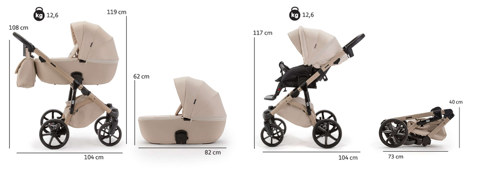 Коляска в собранном виде (Д х В х Ш) – 87 х 119 х 58 см. Размеры шасси в сложенном виде (Д х В х Ш) – 74 х 40 х 58 см. Размер люльки (Д х Ш) – 81 х 39 см. Внутренний размер люльки (Д х Ш) – 70 х 34 см. Размер спального места в прогулочном блоке (Д х Ш) – 88 х 34 см. Размер колес (передние/задние) – 25 / 30 см. Вес: Коляска с люлькой – 13,7 кг. Коляска с прогулочным блоком – 13,8 кг. Вес люльки – 4,7 кг. Вес прогулочного блока – 4,8 кг. Вес шасси с колесами – 9 кг.
